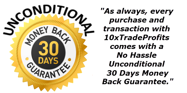 • During our Pre-Launch period, instead of paying $397 per month Regular Price… You won’t even pay the discounted $197 per month price. The Pre-Launch Introductory Offer pricing is available right now, but only to the first 1,000 new Members who take action to grab a spot while they're still available ! Until our software's launch and release, which is occuring between January 12th and January 14th, you can secure one of the exclusive 1,000 membership positions for your first month at a discount of more than 75% off the Regular Price, at the super low price of just $97 your first month ! • And best of all, if you secure this Pre-Launch price now, you can lock-in the $97 monthly rate PERMANENTLY — GRANDFATHERED IN AT THIS ONE-TIME SUPER LOW PRICE, FOR THE LIFE OF YOUR MEMBERSHIP IN THE PROGRAM. • Every subscription with 10x Trade Profits, including the Grandfathered $97 price, comes with a full 30-Day, Unconditional, Money-Back Guarantee! (Does not apply to ongoing future subscription months) |